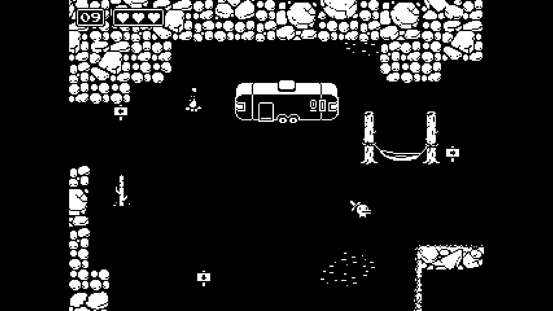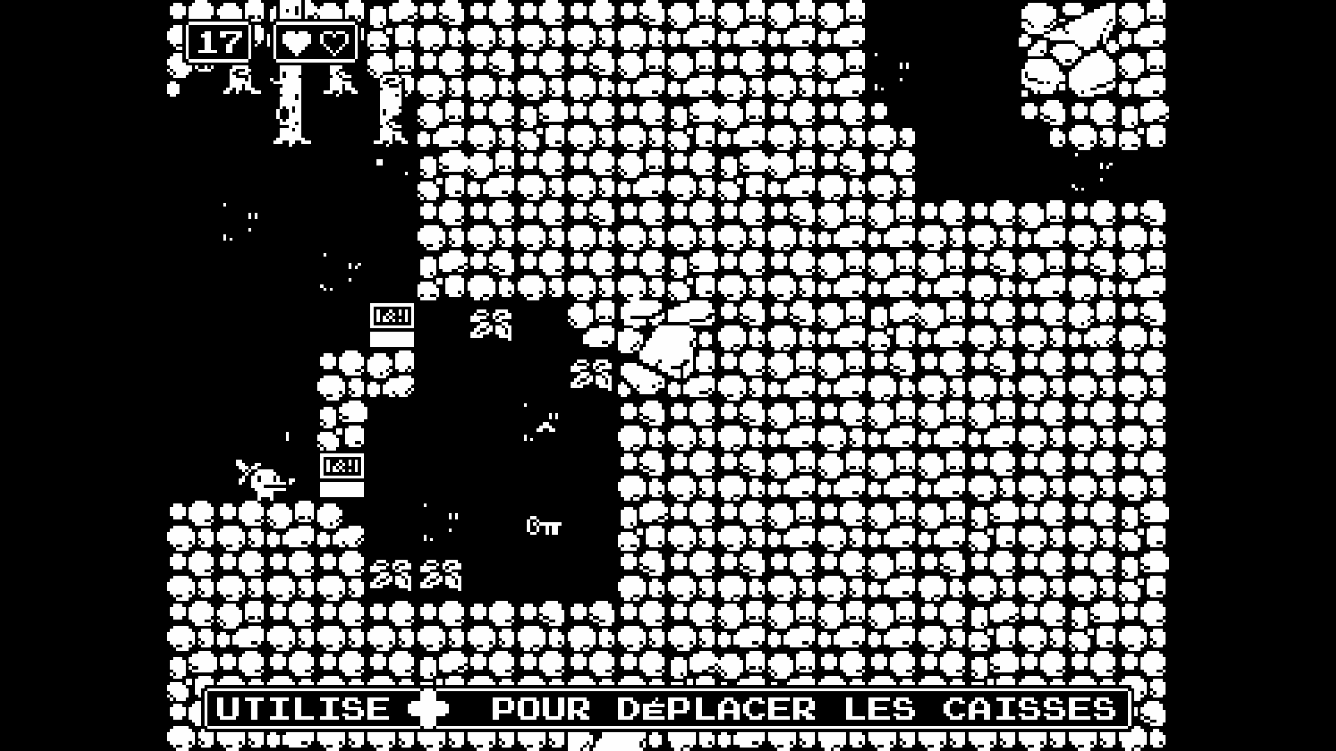 On se retrouve donc à se balader dans un univers assez minimaliste qui rappelle (encore!) le graphisme des jeux Game-Boy de l’époque. Deux cœurs de vie et nu comme un ver voilà comment on débute le jeu (et le Piwi a envie de dire jusqu’ici tout va bien…). Après de (courtes) pérégrinations vous tombez sur une épée que la mer a fait échouer sur une plage : la référence à « Zelda : Link’s awakening » est plus que frappante !