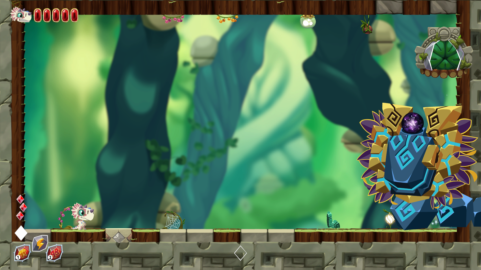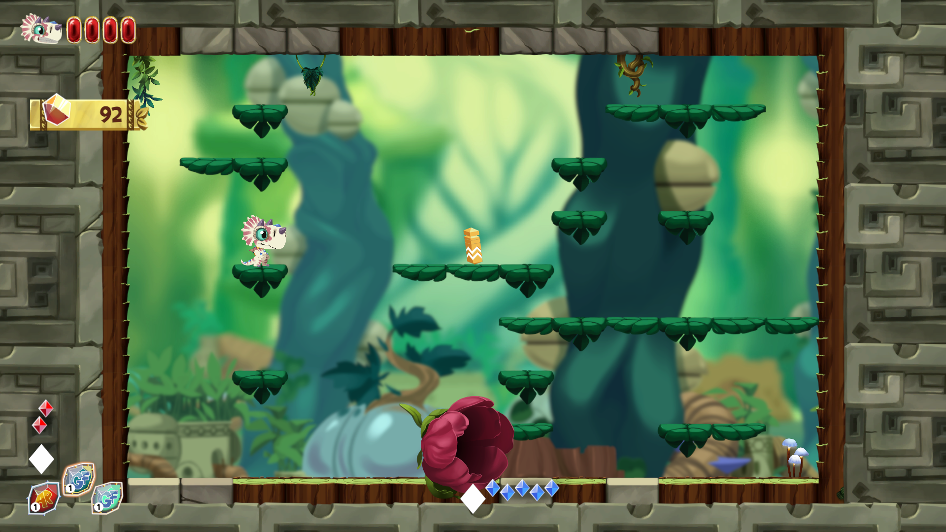 Le but est donc de gravir l’arbre géant pour récupérer l’œuf tant précieux. Les niveaux sont tous verticaux et il s’agit là d’un aspect fondamental du gameplay. Chaque niveau est composé de 4 tableaux ou sous-niveaux au sein desquels vous devez récupérer des cristaux magiques vous donnant un pouvoir qui vous permettra d’accéder au tableau suivant (le Piwi s’est il bien fait comprendre?). Le Piwi développe. De base, votre dragon a un saut (ridicule) et dans les premiers niveaux vous n’aurez qu’à récupérer des cristaux bleus qui vous donnent accès à un super saut dont la hauteur augmente en fonction du nombre de cristaux que vous avez. Au départ donc, il faudra récupérer les 5 cristaux bleus qui vous permettront de sauter jusqu’au tableau suivant. Par la suite, vont s’ajouter des cristaux d’autres couleurs donnant de nouveaux pouvoirs à combiner comme par exemple le vert qui donne la capacité de faire apparaître une plateforme végétale.