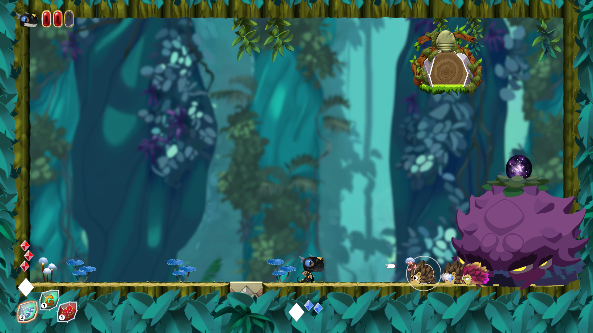 Indéniablement, Dragodino soigne nos rétines. L’aspect cartoonesque est particulièrement réussi, oui le jeu est beau surtout que les ennemis ainsi que votre personnage bénéficient tous d’animations du plus bel effet. Les thèmes graphiques changent tous les trois niveaux ce qui permet de donner une identité propre à chaque partie du jeu. Cette identité se retrouve dans les graphismes mais également et surtout dans le bestiaire qui est fourni et varié. Si dans chaque niveau, certains ennemis ne sont que des trashmobs grossis ou aux sprites de couleurs modifiés, chaque monde a son bestiaire exclusif. On retrouve naturellement les hérissons dans la forêt et les indigènes extraterrestres dans les cités oubliées. Les ennemis ont bien évidement chacun une attaque différentes et que l’on ne retrouve pas chez un autre ce qui oblige le joueur a bien identifier et apprendre les paterns de chaque sbire.