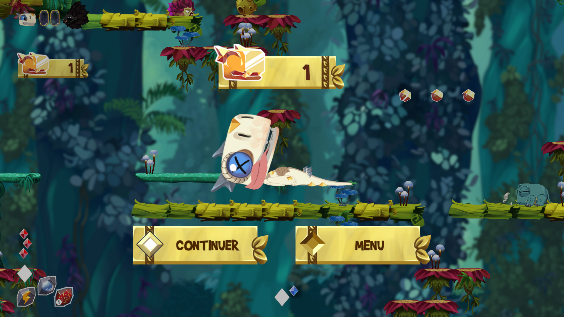 Ensuite, en fouinant comme un dragon (nouvelle expression copyright déposé), on déniche de nombreux collectibles ressemblant à des pierres sacrées de différents types ou encore des pièces bonus. Le Piwi n’a pas réussi à trouver leur utilité mais il faut rappeler que 4 autres personnages peuvent être débloqués dans le jeu. Tout ceci, si vous avez le courage de dompter cette difficulté.
