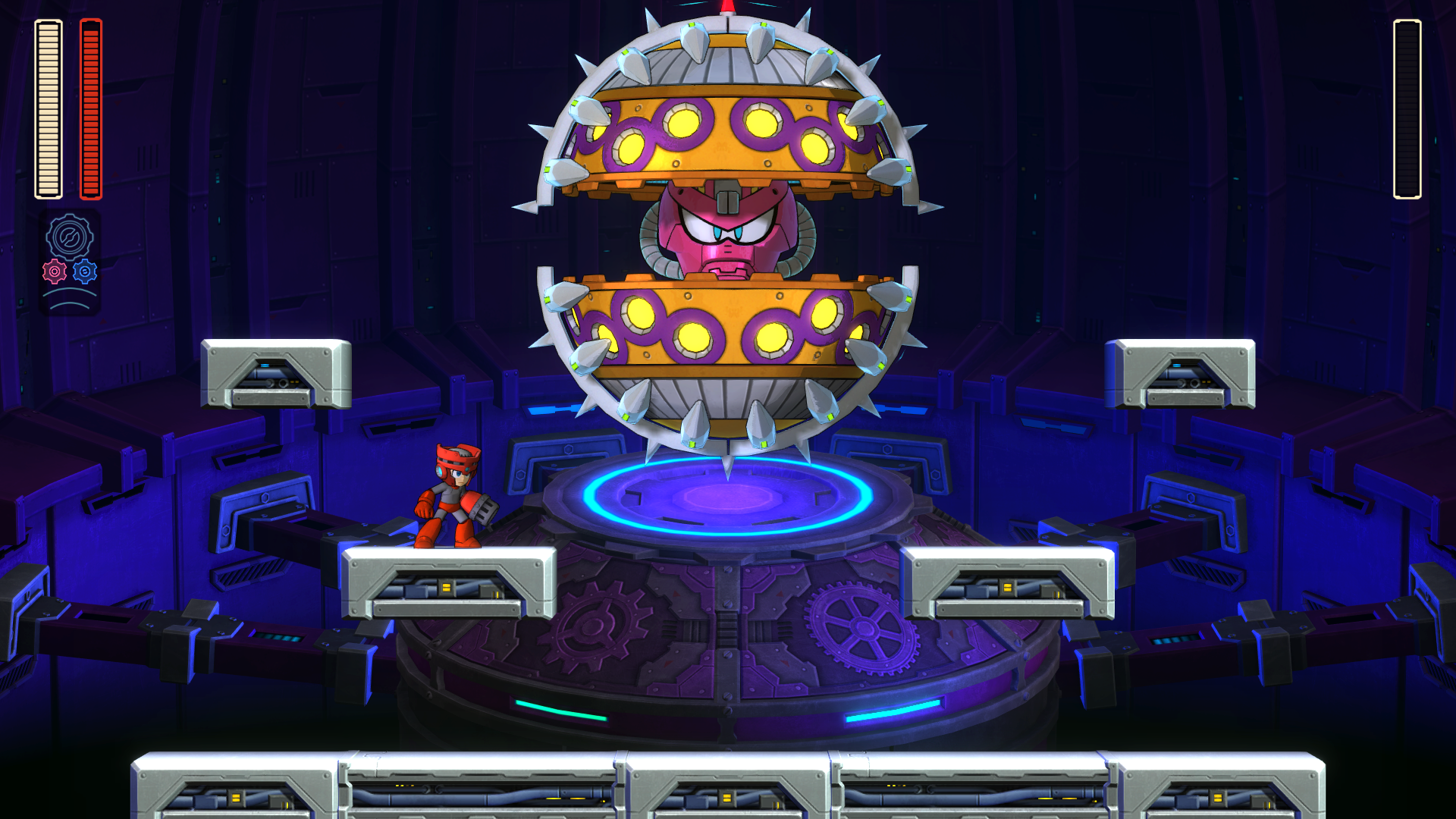 Le Double Gear est LA nouveauté apportée par Mega Man 11 ! Il donne à notre héro deux pouvoirs qui vont se révéler absolument nécessaires si l’on veut parvenir à bout des niveaux qui s’offrent à nous. Via les gachettes gauche et droite nous avons la possibilité de ralentir le temps ou démultiplier la puissance de notre buster pour quelques secondes seulement (même si le Double Gear se recharge très vite en pratique et heureusement!). On retrouve le génie des développeurs : pour rappel, Mega Man c’est un level design aux petit oignons qui imposent au joueur une exécution parfaite. Et bien, dans Mega Man 11, le level design intègre parfaitement ces nouvelles fonctionnalités et les rends absolument indispensables !